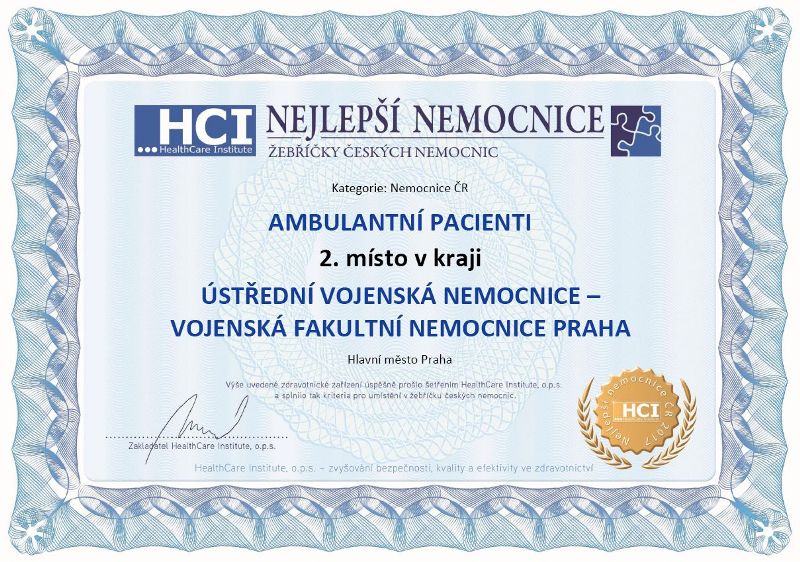 Na základě celkového hodnocení spokojenosti hospitalizovaných i ambulantních pacientů, a také zaměstnanců, se stala ÚVN druhou nejlepší nemocnicí ČR 2017. Více o soutěži, každoročně vyhlašovanou Health Care Institutem, a jejích výsledcích: Celostátní projekt Nemocnice ČR 2017