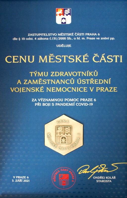 V pátek 3. 9. 2021 převzal náměstek ředitele pro léčebnou a preventivní péči MUDr. Ivan Jeřábek, od zastupitelstva Prahy 6 Cenu městské části, která byla udělena týmu zdravotníků a zaměstnanců Ústřední vojenské nemocnice v Praze za významnou pomoc Praze 6 při boji s pandemií covid-19.