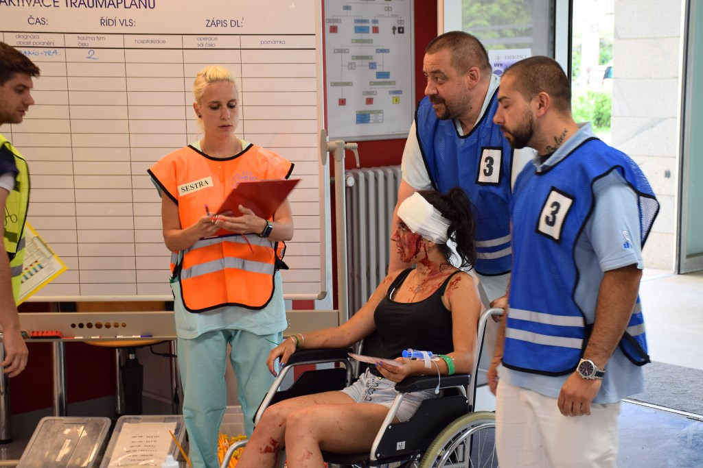Raz, dva, tři, teď - zdravotníci přemisťují zraněného na lůžko. Mezitím sanitky přivážejí další a další zraněné, informace o nich důsledně zapisuje sestra. Ve 14.37 hlásí dispečink Zdravotnické záchranné služby hl. m. Prahy, že jsou všichni zranění již transportováni z místa mimořádné události a kontroluje s kontaktním místem ÚVN, zda souhlasí stavy přepravených zraněných osob do ÚVN. Poslední ze zraněných je ošetřen a odvezen k hospitalizaci na odborné pracoviště krátce před 15. hodinou. V 15.05 nácvik aktivace traumaplánu ÚVN končí. Ještě vše uklidit a pracoviště Emergency přechází opět do běžného režimu.