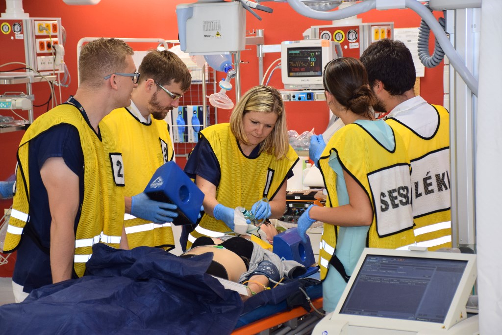 Ve 14:08 hod. přijíždějí první sanitky se zraněnými. Boj o záchranu životů začíná. Vedoucí lékař směny se sestrou v rámci třídicí skupiny třídí a označují raněné podle závažnosti jejich zdravotního stavu. Jednotlivé týmy se ujímají přidělených pacientů a poskytují jim odbornou zdravotní péči.