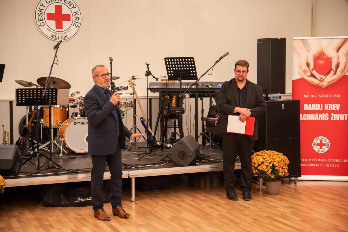Jménem ÚVN dárcům poděkoval a předal ocenění MUDr. Miloš Bohoněk, Ph.D., primář OHKT a přednosta Ústavu laboratorní medicíny, hematologie a transfuziologie FBMI ČVUT a ÚVN, který je současně členem výkonné rady a místopředsedou OS ČČK Mělník.
